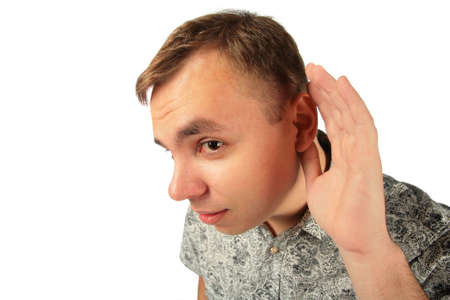 Caucasian man hold hand near ear. Trying to hear a gossip