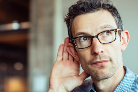 A close-up of a man in glasses cupping his hand to his ear, trying to listen to a conversation. He is eavesdropping with a focused look in an office.