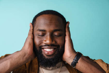 Stylish Afro American guy in earphones is listening to music, on gray background