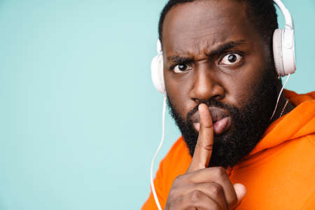 Displeased african american man in headphones showing silence gesture at camera isolated over blue background