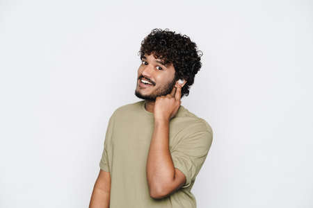 Young middle eastern man smiling while listening music with earphones isolated over white wall