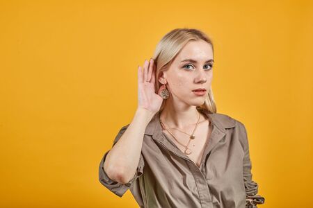 Attractive guy with long blonde hair, substituting a hand to his ear, eavesdrops with an interested face on a gray background