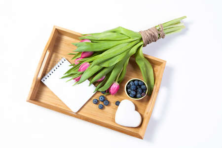A tray with tea and gingerbread in the shape of heart and a bouquet of tulips on the chair