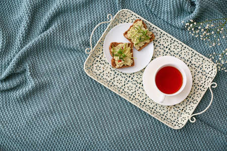 Romantic breakfast in the bed: cookies, hot coffee, flowers and open book. vintage style filtered and toned