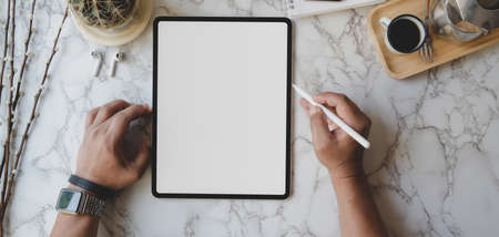 Overhead shot of stylish workspace with blank screen tablet and office supplies on marble desk background