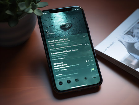 KUALA LUMPUR, MALAYSIA - 6th August 2017: A smart phone with Spotify application on the screen over wooden texture background. Spotify is a music, podcast, and video streaming service.