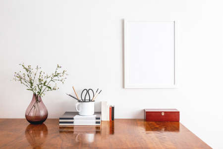 Mock up poster frame on the wooden table. Modern interior design
