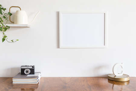 The stylish interior with mock up photo frame, leafs, plant, books, notebooks and lama pot.. The minimalism concept of space.