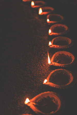 Happy Diwali - many Terracotta diya or oil lamps arranged over clay surface or ground in one line or curved or zigzag form, selective focus