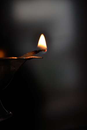 Close up of classic candle with orange flames burning on wax with bokey of other candles in church