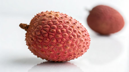 detailed lychee cluster showing vibrant red and textured surfaces, peeled to reveal soft white fruit, angled close-up view, isolated on light peach background --no shadow, people --chaos 12 --ar 1:1 --weird 150 --v 6.1 Job ID: 94f93998-cbe3-41c4-a4a3-42075c9e4f97