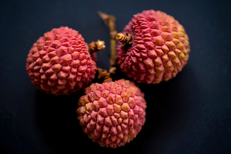 A close-up, high-angle shot showcases three vibrant, pinkish-red lychee fruits clustered together on a thin stem against a dark, matte background.