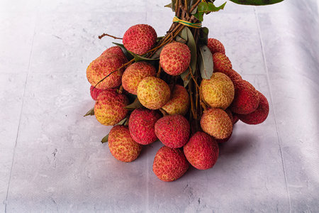 Several litchi lying on a white table. Still referred to as the Chinese lychee, plum or Chinese