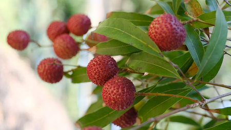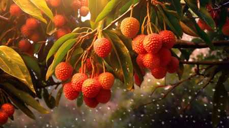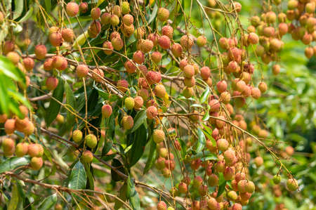 Ripe lychee fruits on the tree in the garden.