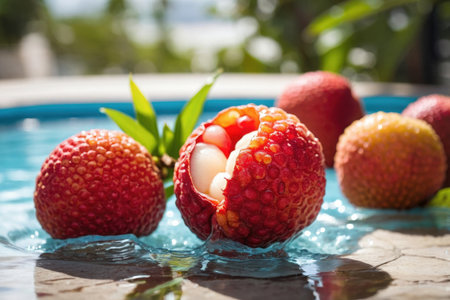 AI Generative Exotic fruit lychees in splashing water on summer swimming pool vacation background