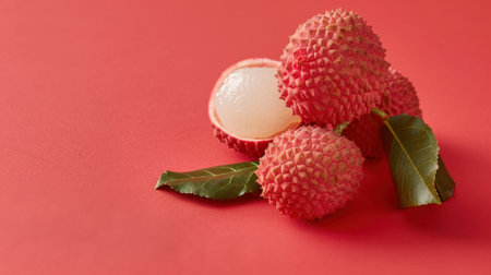 Three lychees, one of which is cut open, are arranged on a red surface. Green leaves peek out from behind the lychees, adding a touch of natural beauty to the scene.