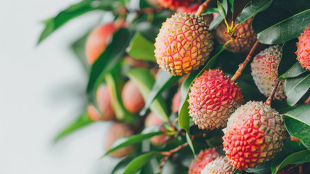 Mouthwatering lychee fruits nestled amid lush greenery, against a serene white background, symbolizing freshness and purity