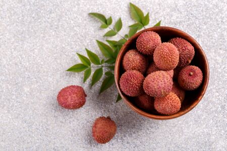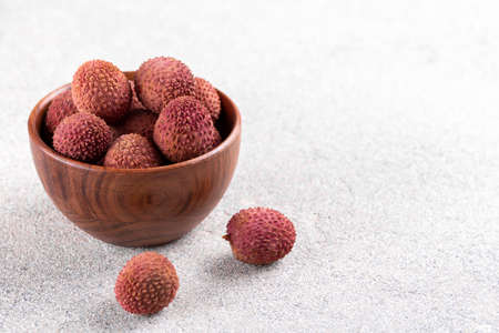 Ripe healthy lychee fruit in a wooden bowl on grey stone background with copy space