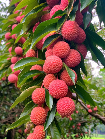 Ripe lychees on a branch in the orchard.