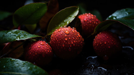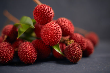 Fresh red lychee fruits with leaves on a dark background.