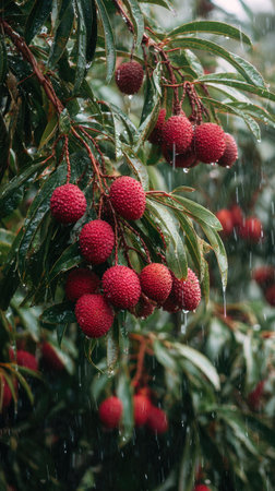 Lychee in a storm, heavy rain pouring down, strong winds twisting their leaves, natural.