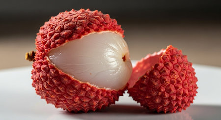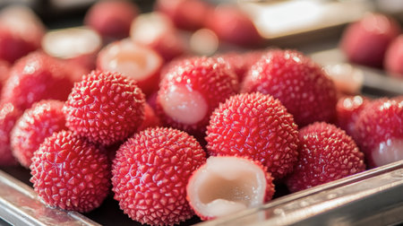 Close-up of fresh Thai lychees, their bright red skin peeled back to reveal the juicy, sweet flesh inside.