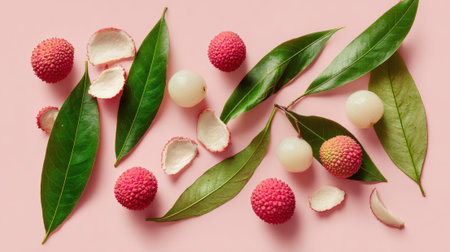 Lychee fruit with leaves on pink background, tropical composition.