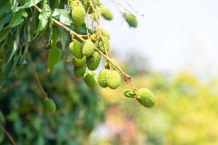 Lychee, Lichi (Scientific name: Litchi chinensis Sonn.) The raw green fruit is growing on the tree, on a blurry natural background in summer with warm sunshine.