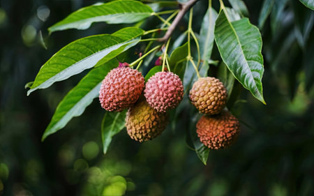 Picture of almost ripe lychee fruits hanging from the tree