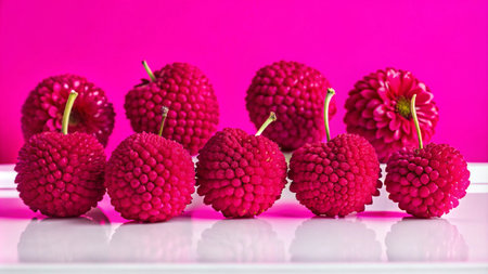 A group of pink flowers and berries arranged in a row on a white surface, with a pink background.