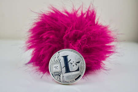 Silver litecoin coin with a pink hairy ball. Digital cryptocurrency.