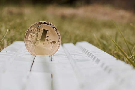 Digital currency physical gold litecoin coin on white keyboard in garden on green grass.