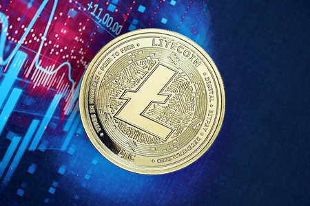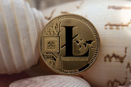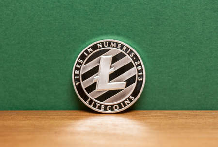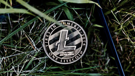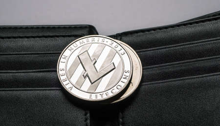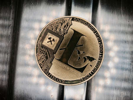 Physical version of Litecoin, new virtual money. Conceptual image for worldwide cryptocurrency and digital payment system called the first decentralized digital currency