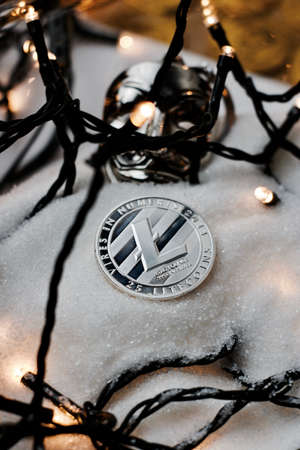 Digital currency physical metal silver litecoin coin. Christmas snow concept.