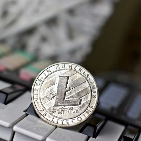 Digital currency physical silver litecoin coin on white computer keyboard