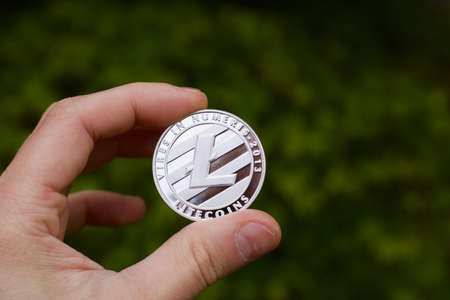 Digital currency physical metal silver litecoin coin. Cryptocurrency outdoor concept.