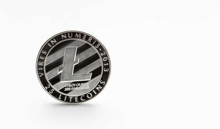 Isolated with clipping path, the silver Lite Coins symbol close up. Lite Coins is one of the digital currency - cryptocurrency driven by blockchain technology.