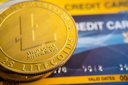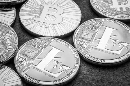 Litecoins or electronic worldwide exchange virtual money, blockchain, cryptocurrency online concept.