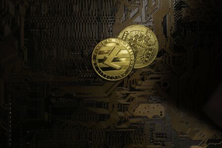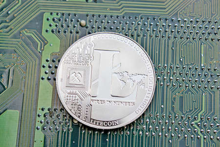 Closeup shot of litecoin over motherboard