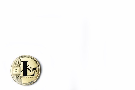 Digital currency physical gold litecoin coin near silver background.