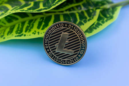 litecoin financial still life with fresh green leaves on a blue background in a digital or virtual cryptocurrency investment concept