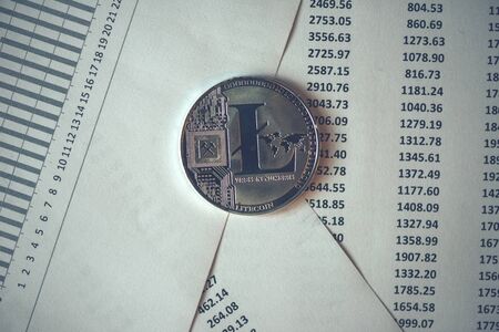 Digital currency physical metal litecoin coin near business white letters inscription.