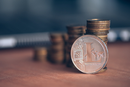 Trading with Litecoin cryptocurrency, coin stack with laptop computer in defocussed background, conceptual image