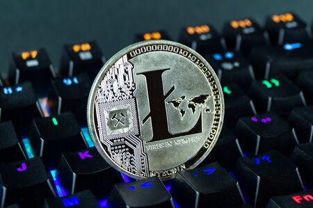 Coin cryptocurrency litecoin close-up of the colour-coded keyboard background