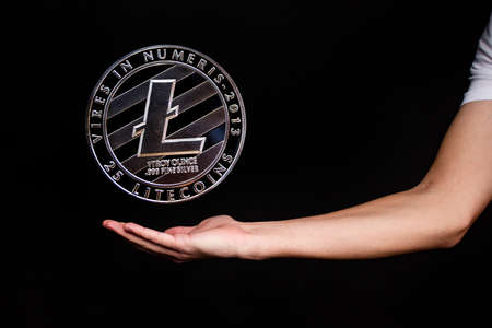 Litecoin coin and a man's hand on a black background. A symbol of technology and a new means of currency settlement