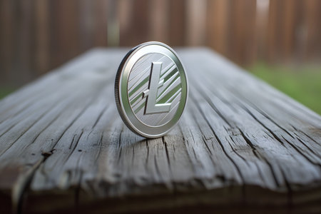 An AI illustration of a litecoin on a wooden table in front of a natural outdoor field backdrop.