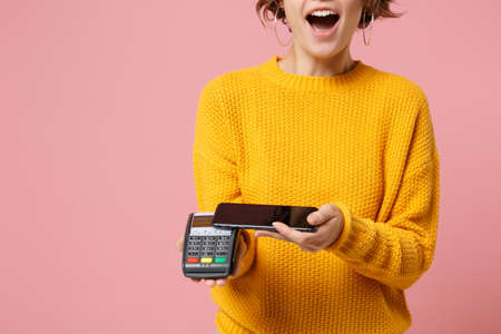 Cropped image of woman in yellow sweater posing isolated on pink background. People lifestyle concept. Mock up copy space. Hold payment terminal to process, acquire credit card payments, mobile phone.