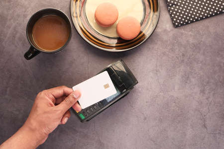 Payment for purchases with credit card. Payment pos terminal top view