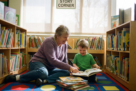 A happy grandmother points at a storybook while sitting on a colorful floor rug with her young grandson near bookshelves in a bright library story corner.