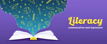 Literacy web banner illustration concept of open book with colorful high school subject icon doodles. Communication and expression typography quote design for reading education.